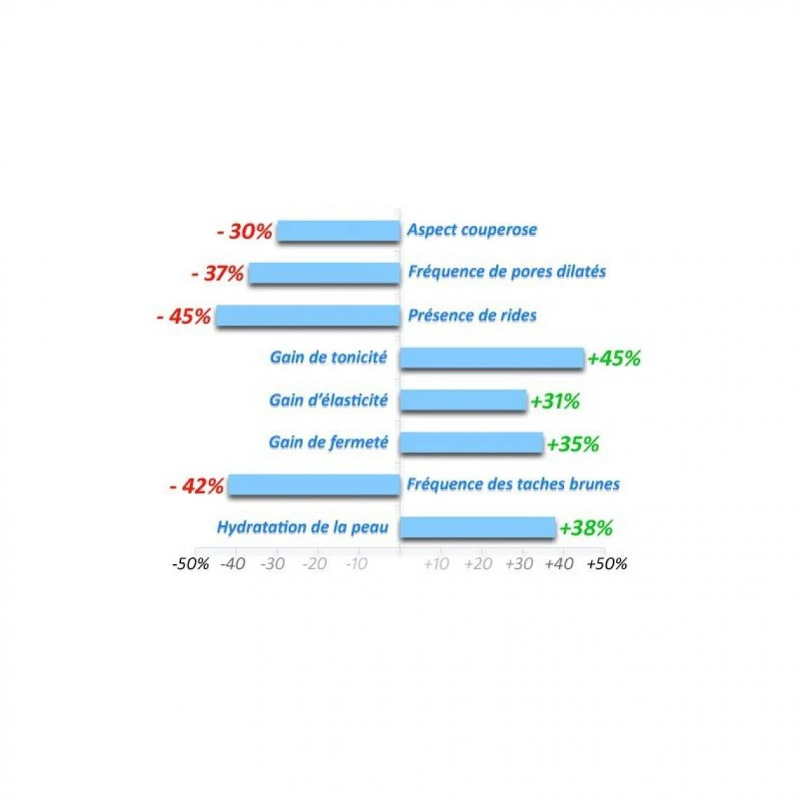 – la peau gagne en fermeté de 35%, en élasticité de 31% et en tonicité de 45%,